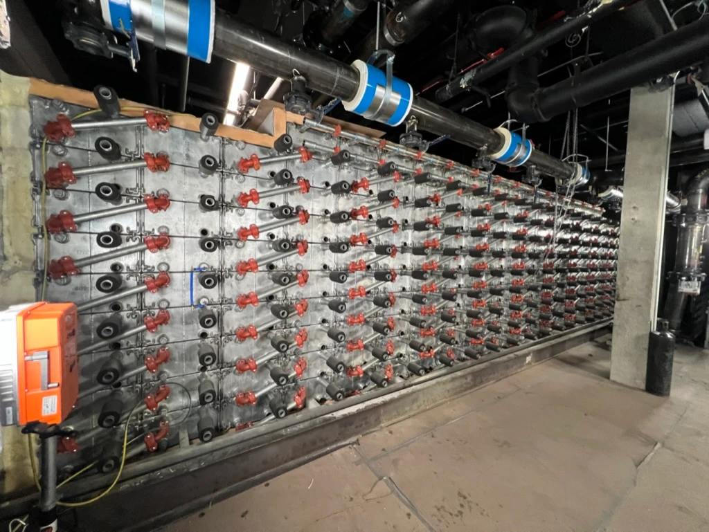 Installed at the iconic Beverly Hilton, Nostromo’s carefully implemented project involved retrofitting the 69-year-old building into a state-of-the-art Grid Interactive Asset, during which 300,000 pounds of IceBrick cells and supporting hydraulic and electric equipment were brought in through a 3-foot corridor and installed in a refurbished old boiler room. Read More